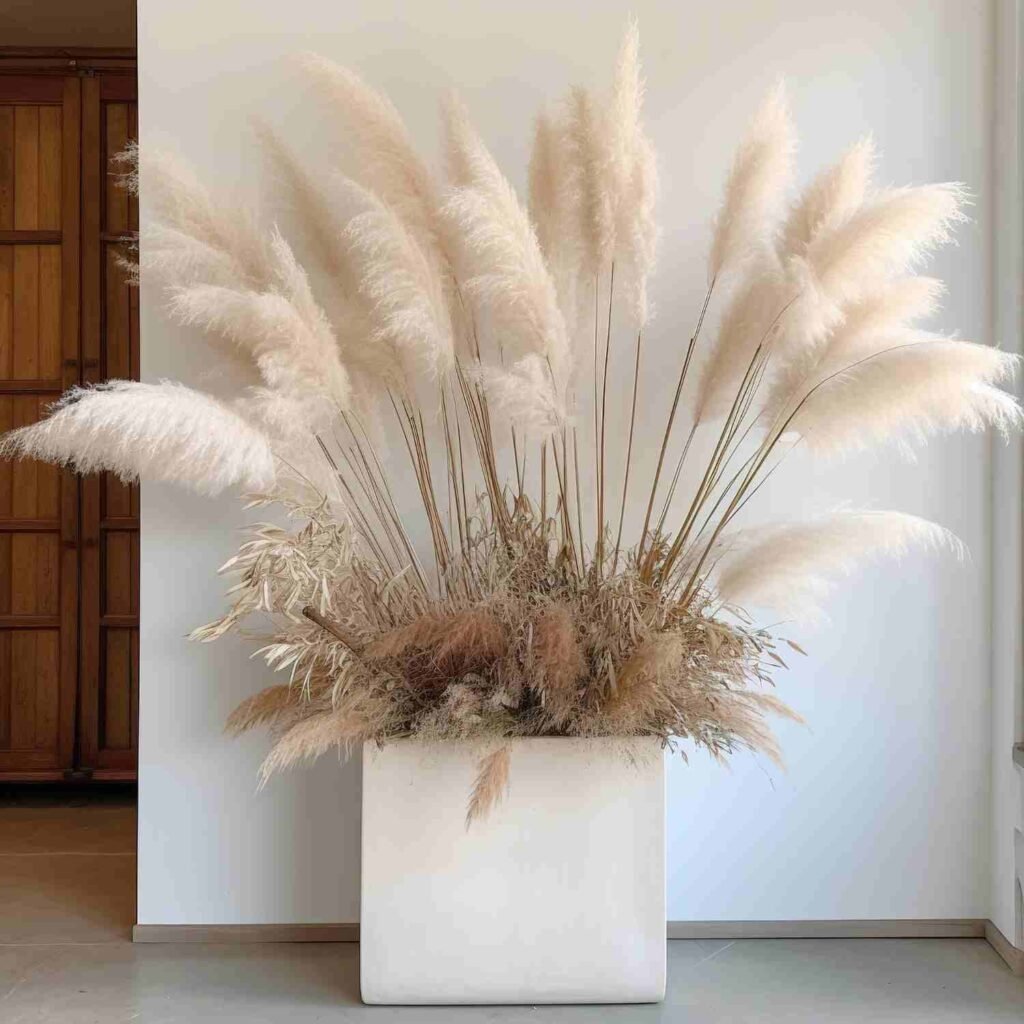 Les panicules de la herbe de la pampa sont devenues des incontournables de la décoration intérieure lorsqu’elles sont séchées : elles apportent volume, texture et une touche bohème-chic très actuelle.